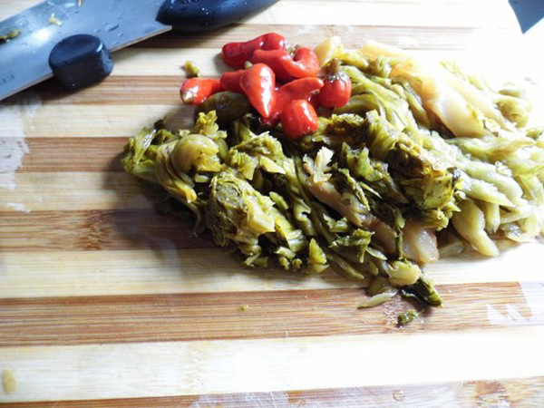 5. 下入酸菜和红泡椒煸炒7、8分钟。